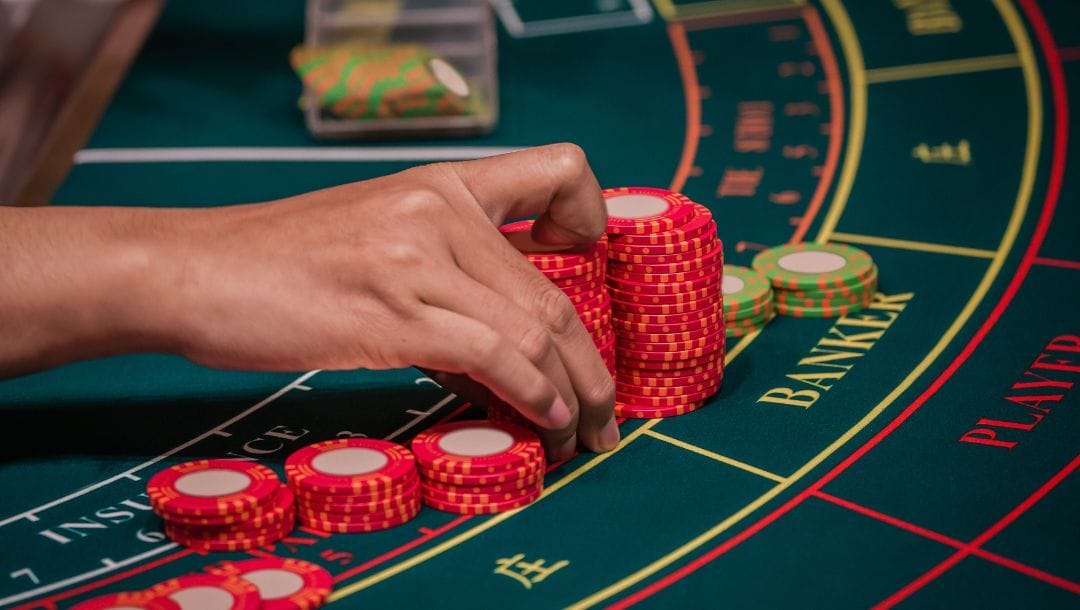 The Role of the Banker in Baccarat: What You Need to KnowA close-up of a woman's hand on a baccarat table, pressing down on a yellow BANKER bet marker next to a green and white casino chip placed in the BANKER section. The table is dark red with gold and white markings for different betting options.